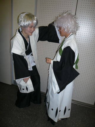 ↑← 吉良イヅル:椎名りいとさま 先程の茜雫ちゃんがイヅルに変身! 素敵な三番隊隊長&副隊長コンビです! ↑→ 日番谷の身長に合わせてわざわざ屈むギン。 という素敵シチュエーション。 「日番谷隊長は小さいなぁ」 「・・・(怒」 ← ミュージカルより 実はギンの羽織は六番隊仕様だったり(ぇ イヅルに頑張って隠してもらいましたwww |